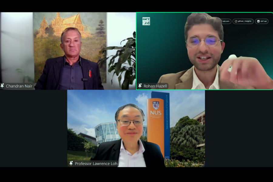 Chandran Nair, Founder and CEO of Global Institute For Tomorrow (top left), Rohan Hazell, Managing Director of GIFT.ed and moderator (top right), and Prof Lawrence Loh, Director of NUS Centre for Governance and Sustainability (bottom), participate in a discussion.
